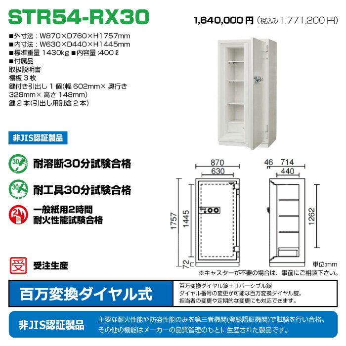 ※返品についてメーカー希望小売価格はメーカーカタログに基づいて掲載しています ダイヤル式防盗金庫 STR54-RX30 商品説明 代引き不可*送料無料*メーカー直送・車上渡し 品番 STR54-RX30 種類 防盗金庫 ロックタイプ ダイヤル錠・リバーシブル錠 外寸 幅870 × 奥行760 × 高さ1757(mm) 内寸 幅630 × 奥行440 × 高さ1445(mm) 内容量 400L 重量 1430kg 性能 耐溶断試験合格 耐工具試験合格 JIS 一般紙用2時間耐火性能試験合格 装備 取扱説明書棚板3枚鍵付き引出し1個(幅602mm×奥行き328mm×高さ148mm)鍵2本(引出し用別途2本) 備考 日本製 受注生産リロッキング機能付キャスターが不要の場合は、事前にご相談下さい。