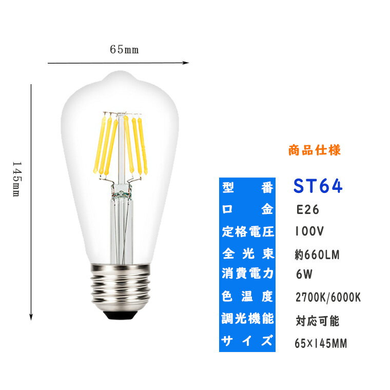 商品仕様 商品名 エジソンバルブ ST64(edisonbulb-st64) サイズ(約) Φ65×145mm 商品内容 電球本体のみ(ソケットは付属しません、別売り) 点灯パターン 常時点灯・消灯 定格電圧 100-110V 口金 E26 消費電力 6 W 全光束 約660ルーメン 色温度 2700K(電球色),6000K(昼白色) 使用寿命 約20000時間 照射角度 360° 調光機能 対応 関連ワード エジソンバルブ レトロ 電球 レトロランプ 照明 アンティーク 間接照明 装飾電球 室内インテリア エジソンライト ダウンライト この製品について問い合わせる product-support@kameishoji.jp [初期対応] 商品到着日より起算して1ヶ月以内の商品内部の動作不良または故障に関しては、無償にて修理、または交換対応とさせていただきます。