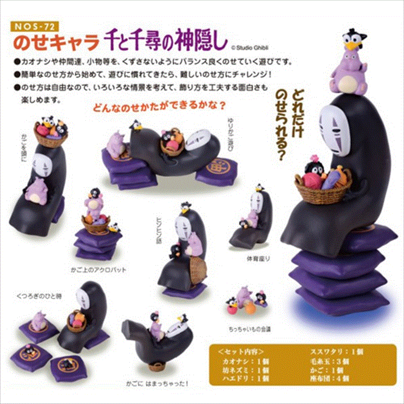 どんなのせ方ができるかな?どれだけのせられる?●セット内容:カオナシ×1個、ススワタリ×1個、坊ネズミ×1個、毛糸玉×3個、ハエドリ×1個、座布団×4個、かご×1個●従来の「つむつむ」シリーズは「のせキャラ」シリーズにリニューアルとなります。