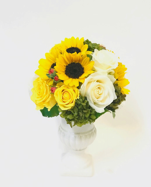 ひまわり、トルコキキョウ ヒペリカム アイビーバラなどでアレンジしました。