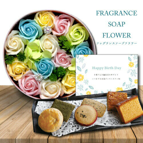 【 あす楽 】 誕生日プレゼント 花とスイーツ ソープ フラワー ボックス 2L ミックス & 和菓子 カステラ クッキー ギフト セット プレゼント お祝い 退職祝い花 結婚祝い花 母親 50代 60代 70代 花 (DB) [花セ] フラワーギフト 花とお菓子お花