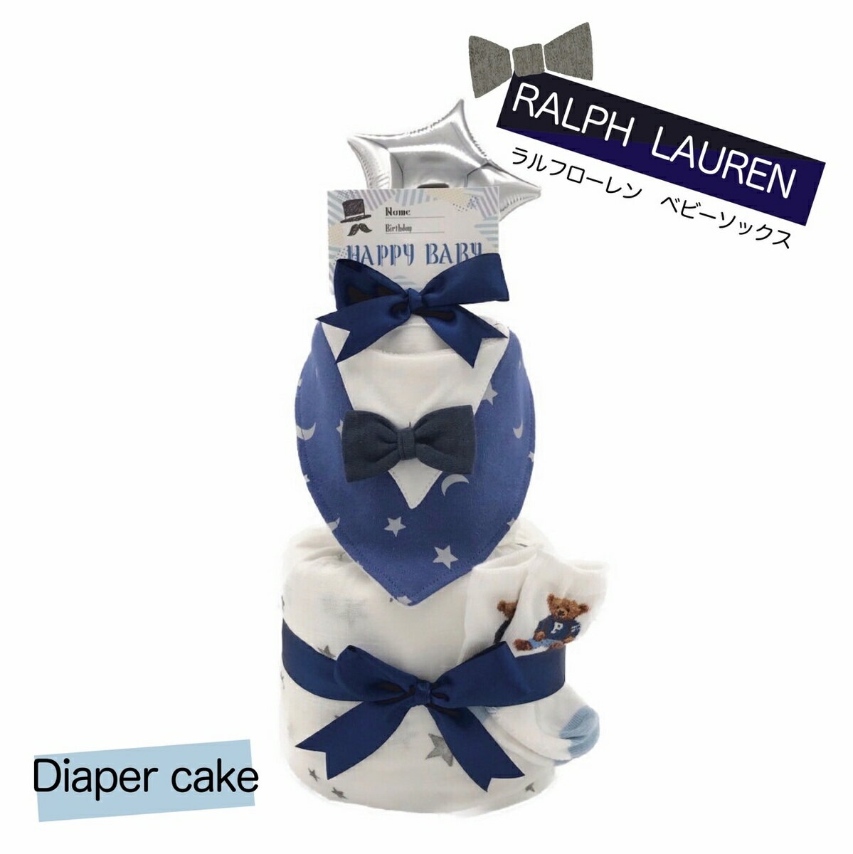 おむつケーキ ラルフローレン 出産祝い 男の子 おしゃれ 赤ちゃん スタイ セット ギフトセット ベビーソックス 出産 祝い プレゼント ギフト おむつ スワドル ソックス ブランド Ralph Lauren かっこいい 星柄スワドル お出かけスタイ