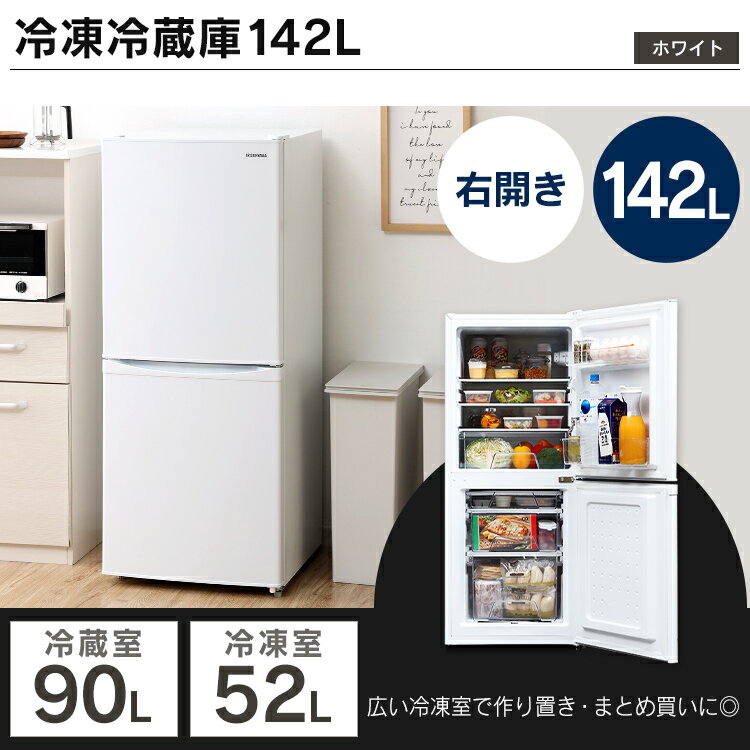 ■セット内容・ノンフロン冷凍冷蔵庫 142L ホワイト・縦型洗濯機 5.0kg IAW-T503E-W ホワイト・単機能レンジ ターンテーブル 17L ホワイト IMG-T177-5-W 50Hz/東日本・ジャー炊飯器 3合 RC-ME30-W ホワイト・スティッククリーナー PIC-S2-S・ケトル ベーシックタイプ ホワイト IKEB-800-W 【ノンフロン冷凍冷蔵庫 142L ホワイト】●種類:ノンフロン冷凍冷蔵庫●冷媒:R600a●ドア数:2●ドア開閉方向:右開き●商品サイズ(cm):幅約50.0×奥行約54.9×高さ約121.5●質量:約40kg●定格電源:AC100V 50Hz/60Hz●定格内容積:全体/142L(冷蔵室:90L、冷凍室:52L)※1●冷凍室の性能※2記号:フォースター冷凍負荷温度(食品温度):-18℃以下冷凍食品の保存期間の目安:約3か月●年間消費電力量:259kWh/年※3●電動機の定格入力:49/56W●電熱装置の定格入力:8W●省エネ基準達成率:103%●電源コード長:約1.8m●主要材質:鋼板、PS、銅、ガラス等●付属品:製氷皿、玉子トレー※商品の仕様は予告なく変更することがあります。